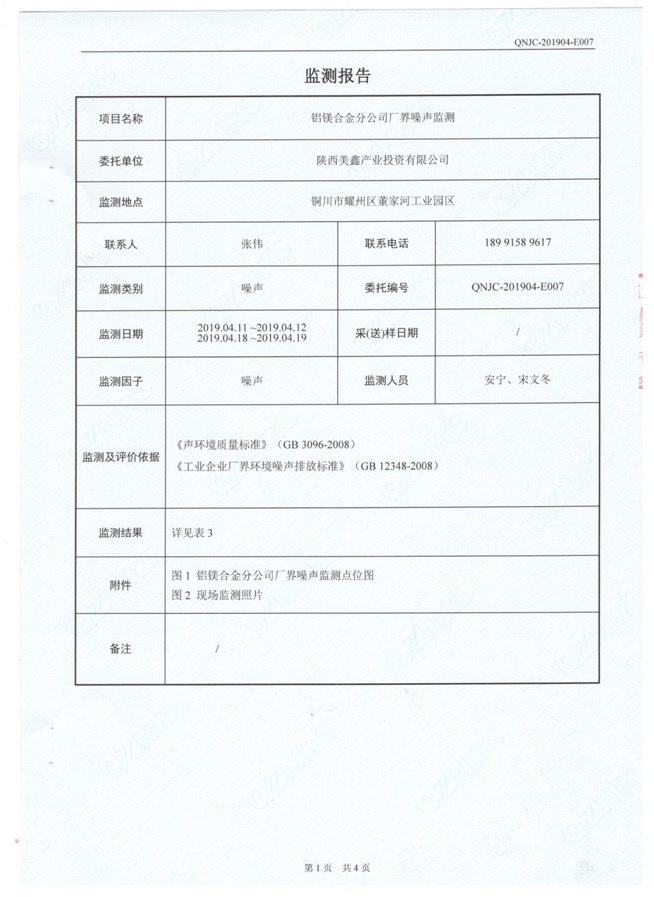 一、基礎信息: 陜西美鑫產業投資有限公司 統一社會信用代碼:91610200567136996Y 法定代表人:高曉兵 生產地址:陜西省銅川市董家河工業園區 聯系方式:09196982605 生產經營和管理服務的主要內容、產品及規模: 美鑫公司在陜西有色、陜西煤化兩大集團的正確領導下,在銅川市委、市政府的關心支持下,充分利用銅川資源型城市轉型政策,依托園區區位優勢,擬投資150億元,建設年產30萬噸預焙陽極、120萬噸煤礦、30萬噸鋁鎂合金及配套動力站、20萬噸鋁深加工、年吞吐量500—800萬噸物流園等循環經濟項目。該集群項目已被列入《陜西省國民經濟和社會發展第十二個五年規劃綱要》,為陜西省“58123”項目之一。美鑫公司以循環經濟為路徑,堅持經濟增長與環境保護協調發展,聚合資源與資本,走綠色發展、清潔發展、低碳發展的循環經濟轉型升級之路。 陜西美鑫鋁鎂合金分公司采用的500kA預焙陽極電解槽,自動化程度高,電解槽打殼、加料全過程均由微機自動控制,從而使槽罩開啟次數顯著降低,電解槽集氣效率能夠達到99%,大大地減少了煙氣無組織排放。項目配置了2套電解煙氣凈化系統,經捕集的煙氣通過排煙支管進入排煙總管,采用電解鋁生產原料—氧化鋁吸附阻濾煙氣中的氟化氫氣體及含氟煙塵,吸附后的載負氧化鋁進入袋式除塵器,經氣固分離后進入石灰石—石膏脫硫系統脫硫。 陜西美鑫產業投資有限公司鋁鎂合金分公司2019年2季度自行監測如下: 二、監測方案: 1 大氣污染源監測