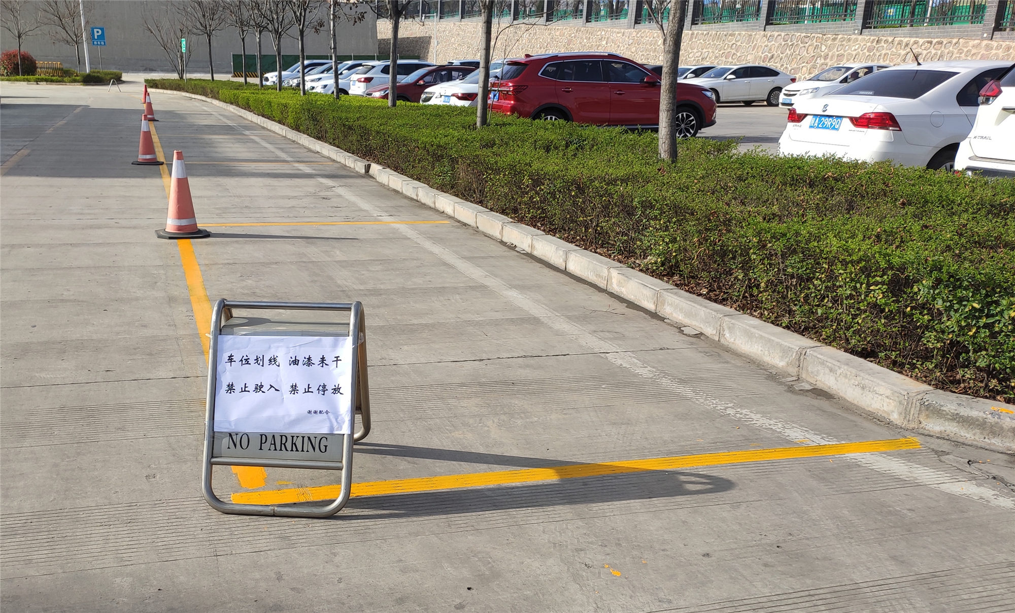 為避免油漆未干之前車輛壓毀新劃定車位,提前在停車區域前做好警示標志,滿足停放條件后對全廠開放。后期,分公司團總支還將對雨水收集池周邊區域進行車位畫線,徹底解決廣大職工停車難題。