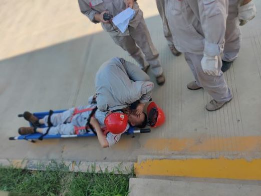 隨著總指揮一聲令下,下午15:00演練準時開始,檢維人員在對4#Z0401綜合管網(wǎng)井巡檢時,因在沒有事先檢測井內氧含量的情況下,私自進入綜合管網(wǎng)井進行違章作業(yè),導致窒息昏厥,同班人員發(fā)現(xiàn)后立即報告車間并撥打120救援電話,車間接到報告后立即啟動有限空間作業(yè)專項預案開展救援并上報領導。各應急小組相繼到達現(xiàn)場,分工展開救援工作。
