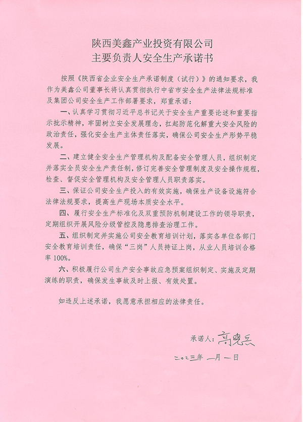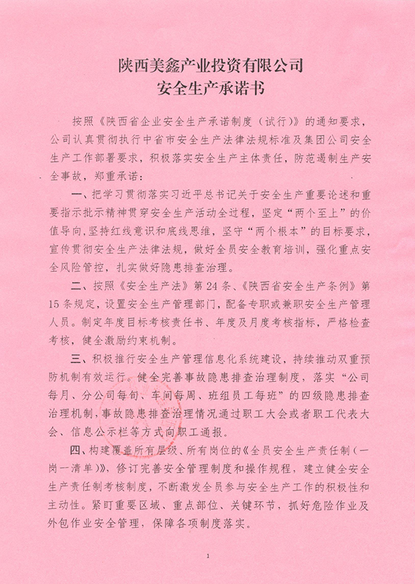 陜西美鑫產(chǎn)業(yè)投資有限公司安全生產(chǎn)承諾