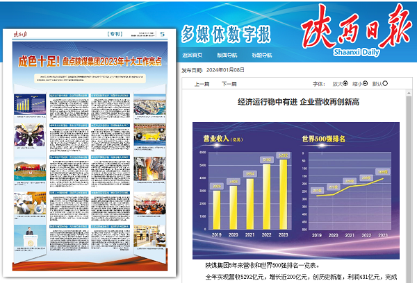 成色十足!盤點陜煤集團2023年十大工作亮點 2023年,在省委、省政府的堅強領導下,陜煤集團以開展主題教育為抓手,緊扣全省“三個年”活動,以“八個聚焦”的扎實行動,深入推動“18765”戰略目標落地,跑出了“奮進者”新姿態,譜寫了高質量發展嶄新篇章。 經濟運行穩中有進 企業營收再創新高 全年實現營收5293億元,增長近200億元,創歷史新高,利潤431億元,完成省國資委全年任務計劃的110%,繼續領跑全省國資系統。完成煤炭產量2.47億噸,同比增長6%。小保當礦業450米超長智能綜采工作面年產量突破1300萬噸,刷新全球2—3米中厚煤層單井單面開采紀錄,曹家灘礦業成為全球單井產能最大的井工煤礦。各類化工產品總量首次突破2000萬噸,同比增長4%。全年發電544億度,同比增長5.5%。積極組織柔性生產,全年生產粗鋼產量1161萬噸。水泥建材、裝備制造、建筑施工、現代物流等板塊實現了穩定發展。連續9年入圍世界500強榜單,位列2023年世界500強第169位,展現出良好的成長性。 樹牢安全發展理念 安全生產開創新局 嚴格落實安全生產主體責任,重點抓好安全生產的全過程控制、全要素管理、全方位監督,構建了“耦合災害分元治、多種災害協同治、時空有序立體治”的災害治理體系,組織開展了五輪全集團重大事故隱患專項排查行動,85家單位建立并投運了雙重預防信息系統,煤炭板塊利用智能信息保障系統,重點管控96處重大安全風險;化工板塊安全管理智能運營平臺與所屬13家單位實現了數據互聯互通、信息共享;7家電廠全部上線運行了雙重預防“一圖一網”信息監控系統。建成國家級安全文化示范企業13家、省級示范企業19家,成功承辦了全省第二屆礦山救援技能競賽。生產安全事故起數和死亡人數同比下降50%,連續26個月未發生較大及以上安全生產事故,創集團成立20年來最好水平。 重大項目開花結果 發展后勁持續增強 錨定高質量項目推進總體目標,制訂了《高質量項目提升年實施方案》,持續加大煤炭產能核增力度,全年累計核增產能1000萬噸。加快年度重點項目建設,西卓煤礦進入聯合試運轉,黃陵2×66萬千瓦發電項目建成投運,漢鋼中厚板項目正式投產,榆林化學180萬噸乙二醇項目實現當年投產當年達產。王峰煤礦、彬長66萬千瓦CFB發電項目、榆林化學DMC一期、技術研究院涇河新城新能源產業基地等項目快速推進。全年建成投產項目9個,竣工驗收項目4個,新開工項目16個,累計完成投資253.4億元。加速布局產業項目,不斷增強發展后勁,新疆煤化一體化項目取得突破性進展,黃陵、信陽2×100萬千瓦、石門2×66萬千瓦煤電項目全面開工,汨羅等一批煤電項目加快落地。全面推進新能源產業布局,取得立項批復裝機1060MW。碳纖維產品順利通過軍工驗證,形成年5000噸生產能力,2萬噸榆林擴能項目已全面開工。 科技人才深耕厚植 賦能產業創新發展 加快科技成果轉化,不斷延伸產業鏈條,持續提升原創能力。礦用無機材料、礦用高分子材料等自主科技成果實現年銷售收入6億元。5000噸/年甲基芳香醚工業化示范裝置已完成7種產品開發,并具備投產條件。催化活化與臨氫熱解技術、煤基特種燃料技術開發等加快攻關。陜西省屬國企煤炭領域首個“煤炭精細勘探與智能開發”全國重點實驗室獲批建設。累計鑒定科技成果項目42項,其中國際領先11項、國際先進20項;獲得授權專利1212項,其中發明專利145項,發布標準30項。全年研發投入強度達1.1%。獲批科技型中小企業5家,高新技術企業14家。持續深耕人力資本,新增高級職稱537人、高技能人才3290人。9個科研團隊入選秦創原“科學家+工程師”隊伍。179名職工獲省級技能大賽獎項。 陜煤亮相國際峰會 內外合作走深走實 繼續加大開放合作,將開放作為高質量發展第一要素。以開放合作不斷提升各類資源要素配置,推動高質量發展。在全球秦商大會、央企助力陜西高質量發展推進會、哈薩克斯坦—中國經貿合作懇談會上交流發言,國內外影響力顯著提升。圍繞集團產業鏈、供應鏈、創新鏈,通過延鏈補鏈,激活外部合作市場空間,與30多個地方政府、央地國企、優秀民企圍繞產業布局、市場開拓、技術創新開展合作交流,達成戰略合作協議11份。積極拓展位于新疆、甘肅等地的省外生產基地,穩妥布局海外化工項目,不斷提升企業整體實力,真正把陜煤打造成具有國際競爭力的一流企業。以內部市場化為原則,強化內部協作考核約束機制,通過強鏈固鏈,增強內部產業鏈韌性,內部協作經濟規模達到460億元。 科學規劃新鮮出爐 轉型升級動能強勁 積極謀劃事關企業長遠發展的產業項目,扎實開展“十四五”規劃中期評估與調整,確立了“18765”新的發展戰略目標。即以10萬左右產業工人為依靠,到“十四五”末用8000億元資產,力爭7家主板上市公司,實現6000億元營業收入,創500億元利潤。在加強項目投資合規性、可行性和有效性論證的基礎上,積極謀劃中長期發展儲備項目,凈調增項目69個,凈調增項目投資總額337億元。其中,重點謀劃新疆煤電化一體化、榆林化學二期兩個千億級項目集群,力爭煤炭產能達3億噸,并逐步形成煤電裝機5000萬千瓦、新能源裝機500萬千瓦的發展規模,煤化工產能超過2500萬噸,精細化率達到60%以上,為陜煤轉型發展提供了有力支撐。 聚焦重點關鍵領域 陜煤制造走出國門 聚焦重點領域,賦能產業發展,加快推出新